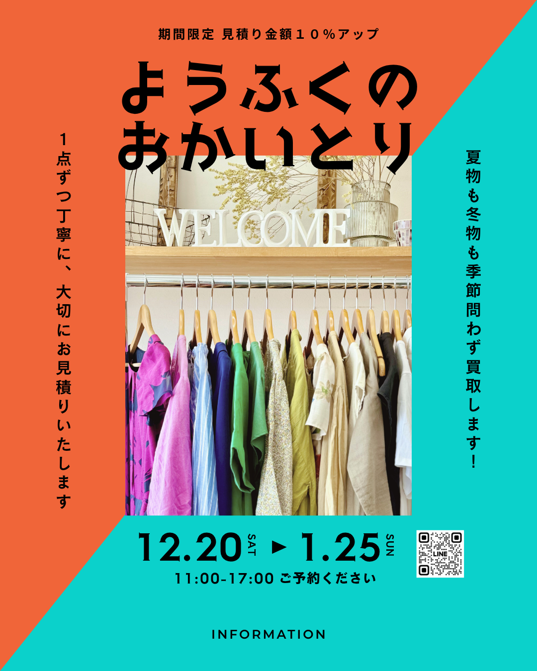 ※お品物をお持ちいただく際は、クリーニングの袋やハンガーは外してお持ちください。
